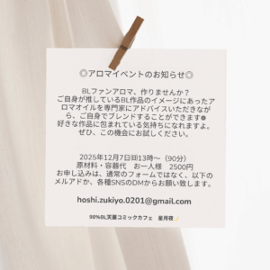 京都からいらっしゃる深泥さんはアロマオイルブレンドデザイナーさんですが、勿論BL好きでもありますので、作品の世界観を壊すことなくアドバイス下さると思いますよ。オフ会のつもりで、ぜひ遊びにきてください♪